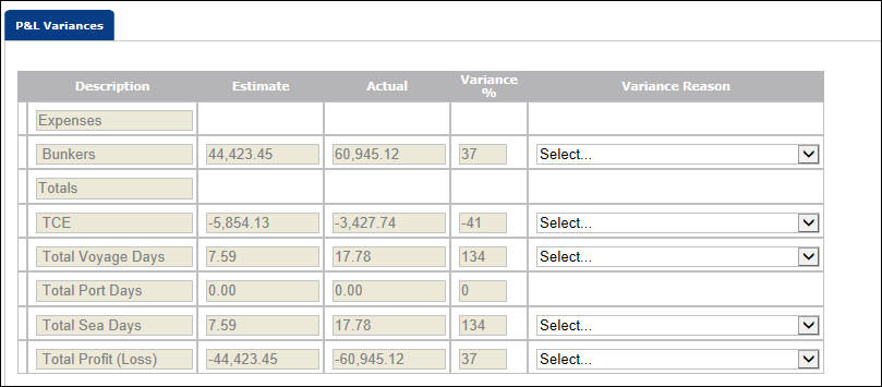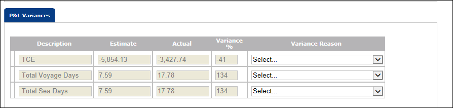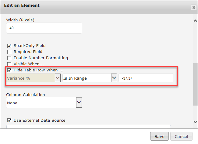 You want to hide rows in the Voyage PnL table for Variance % values that fall within a range of -37 to 37.