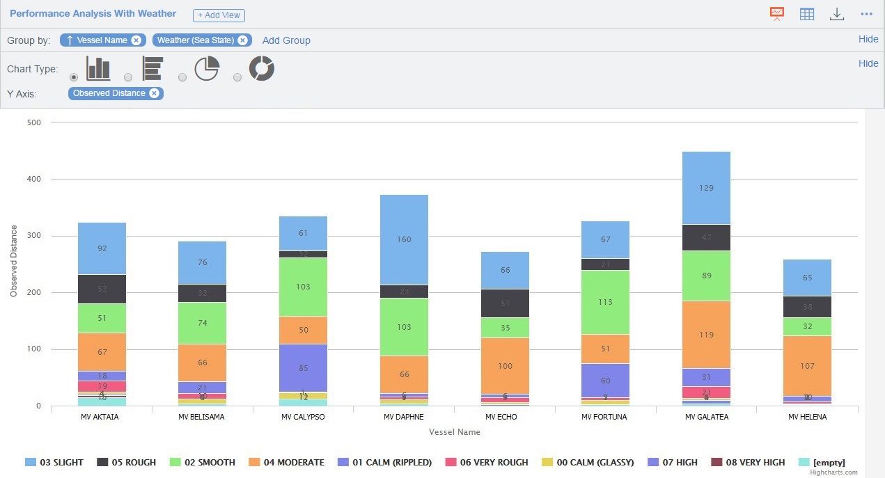 The Reports tab includes up-to-the minute data reported by your fleet, to help you in making your business decisions. It gives you multiple options for visualizing data and the ability to analyze multiple dimensions, like distance, speed, weather, and fuel consumption. To view Microsoft Power BI reports here, based on Veslink form data, import them on the System Configuration page.