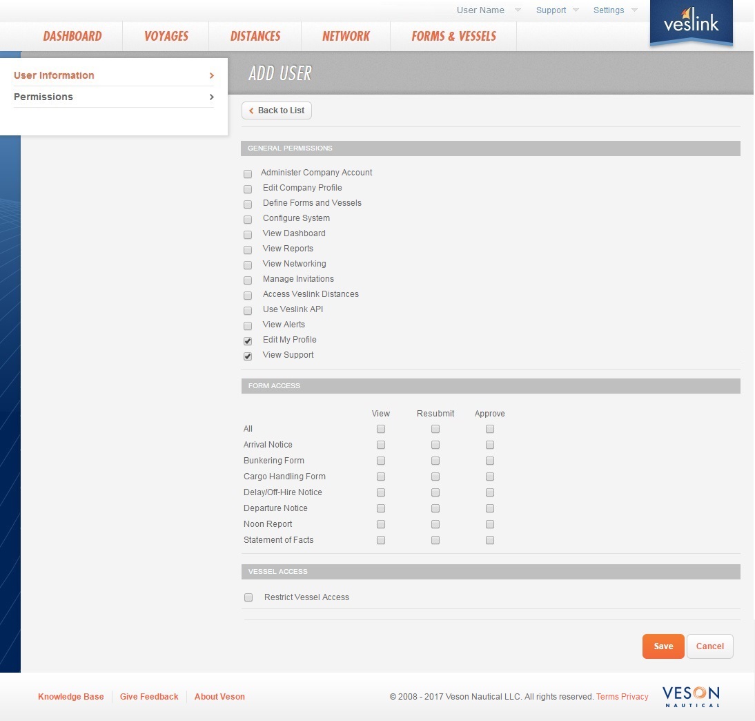 View: View a form. This permission can be used to restrict the vessels to which a user, for example, an owner of a chartered-in vessel, has access.