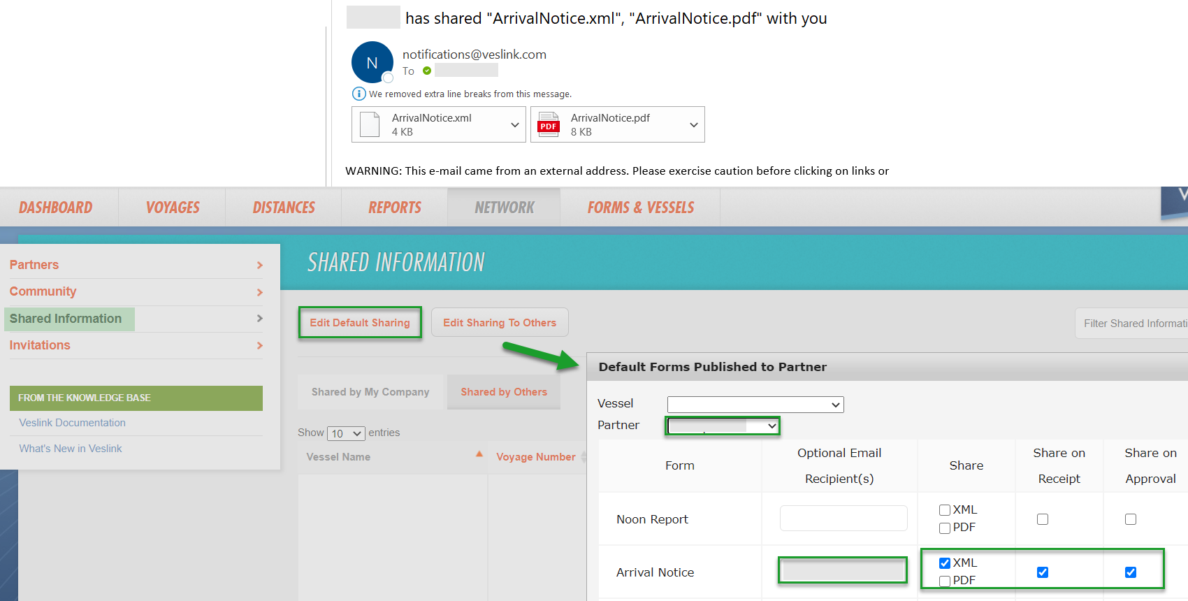 To include PDF or XML type on Veslink form notifications upon sending, make sure to change it in Edit Sharing To Others on the Shared Information option of the Network tab on Veslink.