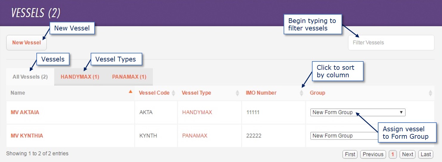 To assign a vessel to a Form Group, select the Form Group from the drop-down menu in the Group column.