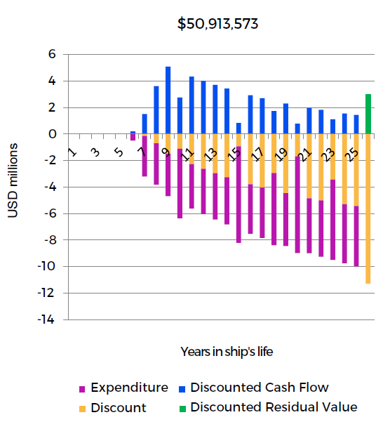 Figure 3. An example chart showing how by using the precise dates and remaining life of the vessel smooths the curve of USD millions over time