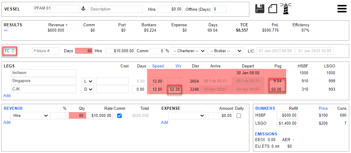 Whenever the days are manually amended under the TC, the Leg (Itinerary) and Hire Days (Revenue) will change accordingly and instantly.