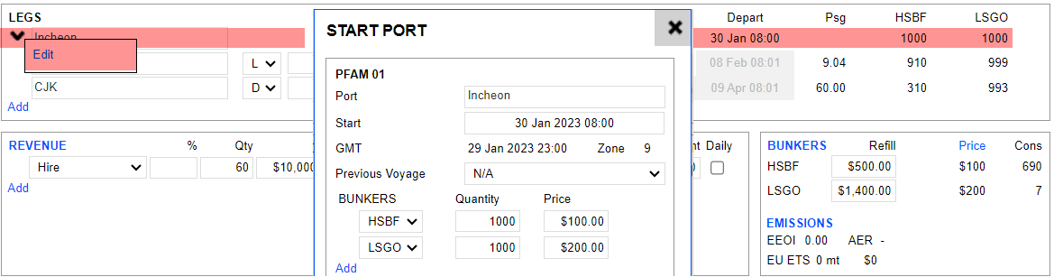 The first port under Leg is considered the start/commencement port. Double-click the line item, hover over the first port, and click Edit to view a pop-up window.