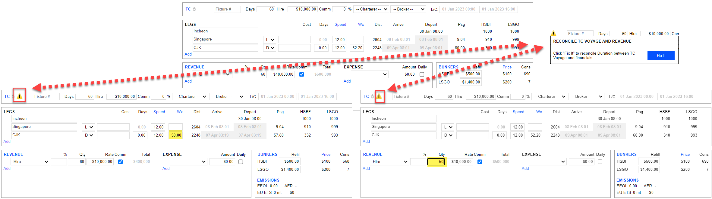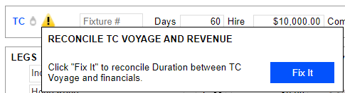 The moment you click Fix It, the days in TC and Hire Days will synchronize with the Leg (Itinerary). Only at this point are the TC Days synchronized across. TC and Hire Days synchronize to the Passage Duration.