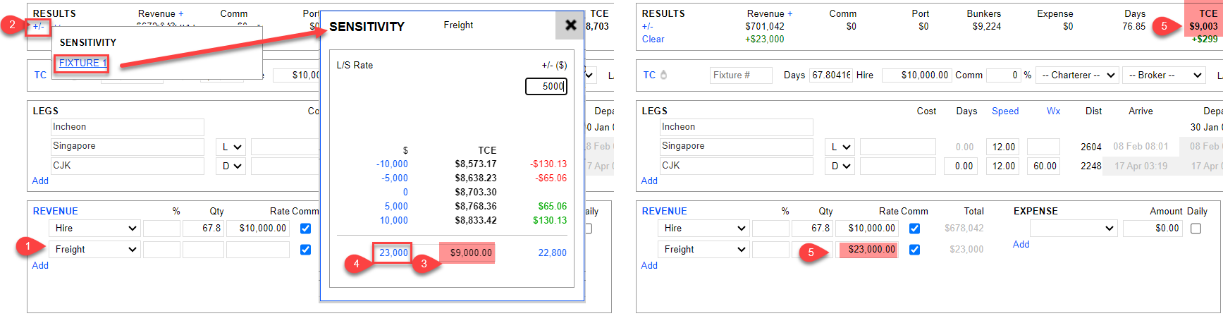 In VMS, the "Freight“ selection under Revenue is used to input Ballast Bonus. You can rely on the Sensitivity Analysis feature here to easily calculate the Ballast Bonus by indicating your desired TCE. Please see the following image for the steps.
