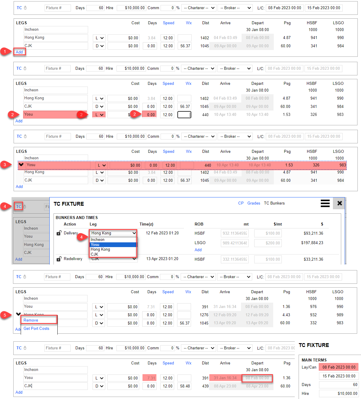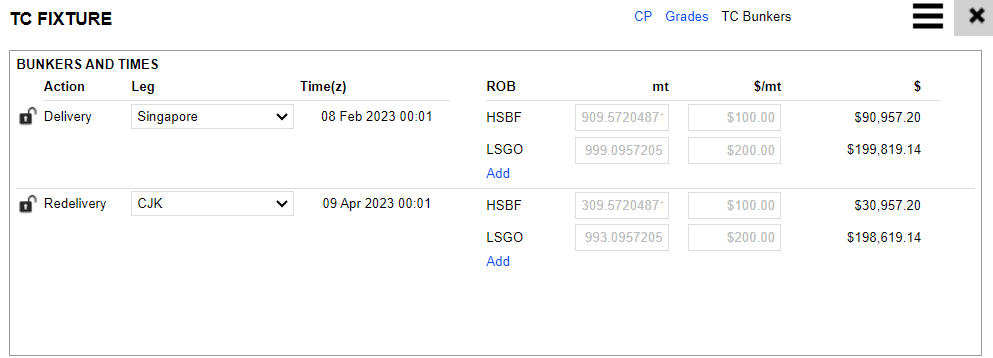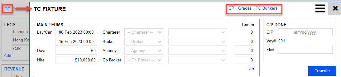 Click TC to open the TC Fixture> TC Bunkers. Change the Delivery from Port Hong Kong to Port Yosu. Close the window.