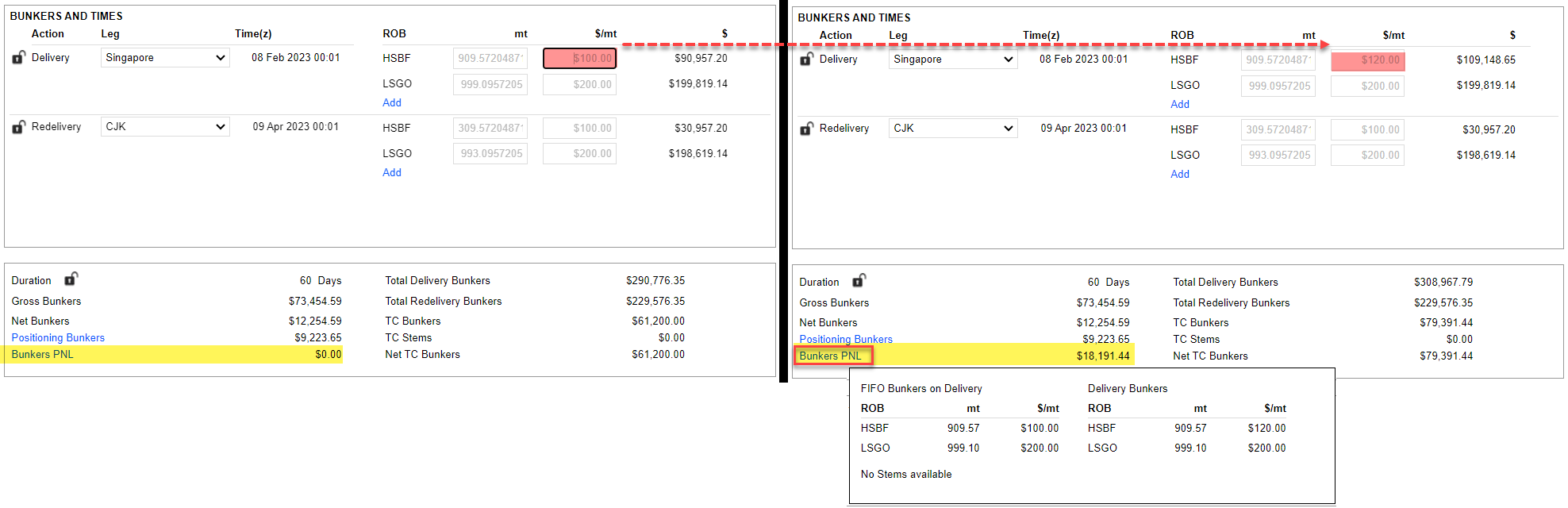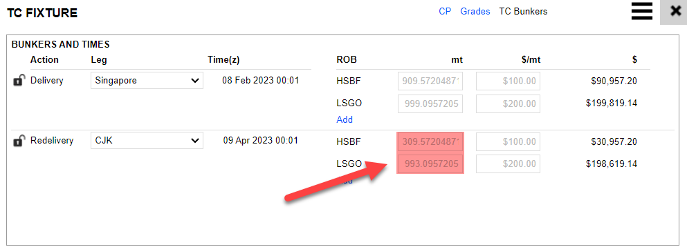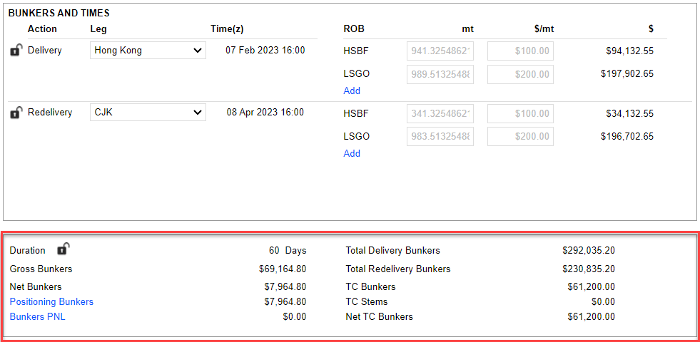 e. Bunkers PNL: When the vessel is delivered to the charterer, the bunkers on board have an inventory value based on FIFO. When this ROB is sold to the charterer on delivery, the price is not necessarily the same as the inventory value. It may be sold at a market value or a C/P value. Bunkers PNL is the resulting difference. Refer to 3.3.2 Delivery/ Redelivery Bunker Qty & Price for more details.