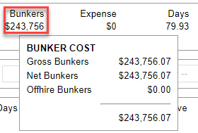 The Bunkers field gives you a quick breakdown of the bunker expenses. For a detailed breakdown of the bunker expenses, refer to 9.0 Bunkers.