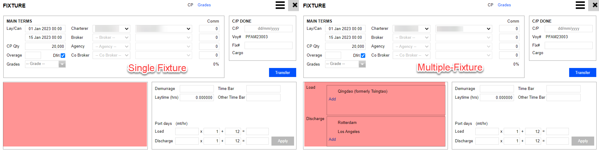In most cases, Multiple Fixture is used when there is more than one Charterer for a single voyage. In order to switch from Single to Multiple Fixture and vice versa, click the menu button inside of the Fixture, followed by Multiple Fixture or Single Fixture.