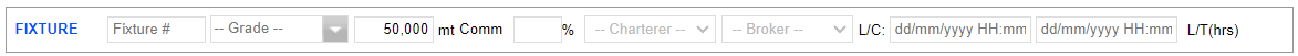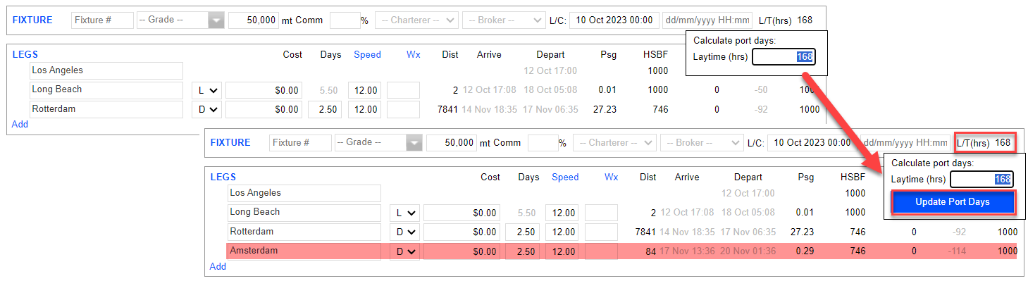 The Fixture Summary shown in the above screenshot will contain the main information pertaining to the main terms. In any case, the itinerary is updated after the Laytime (hrs) is inputted. Left-click on L/T (hrs), and a button appears for the user to click Update Port Days.