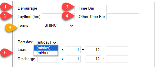 Laytime (hrs): Input total laytime allowed for all load and discharge ports. If you are not using feature no.5, you may input the laytime allowed directly here.