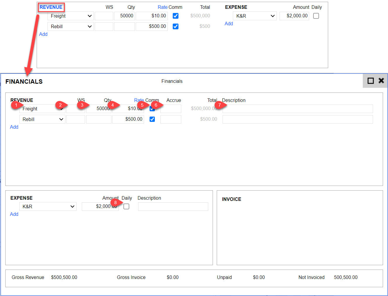 Click Revenue in blue text for the expanded view (Financial). This is where you can input any Revenue or Expense items incurred for this estimated voyage.