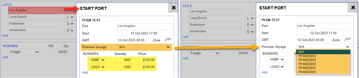 There could be cases where the Estimate is not required to take the data from the last voyage. In this case, you can click the dropdown and select N/A (and manually input ROB/ Start Date) or other voyages.