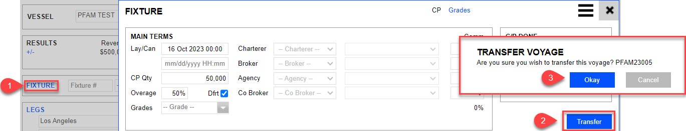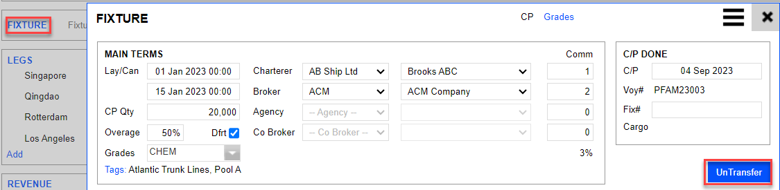 To untransfer a voyage, go to the transferred voyage > Fixture. Select Untransfer.