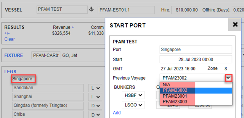Double-click or edit the first port under the leg, and choose the previous voyage to link to. See the following screenshot.