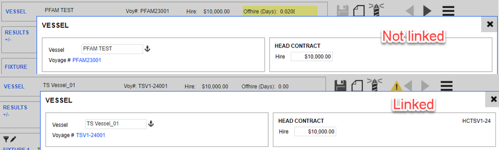 If it is linked, the Head Contract number should be stated in the Voyage’s Vessel, as shown in the following sample screenshot.