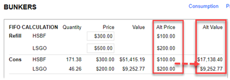It is used to calculate a ‘What If’ scenario: if the bunker is priced at another value, what would the bunker expense be?