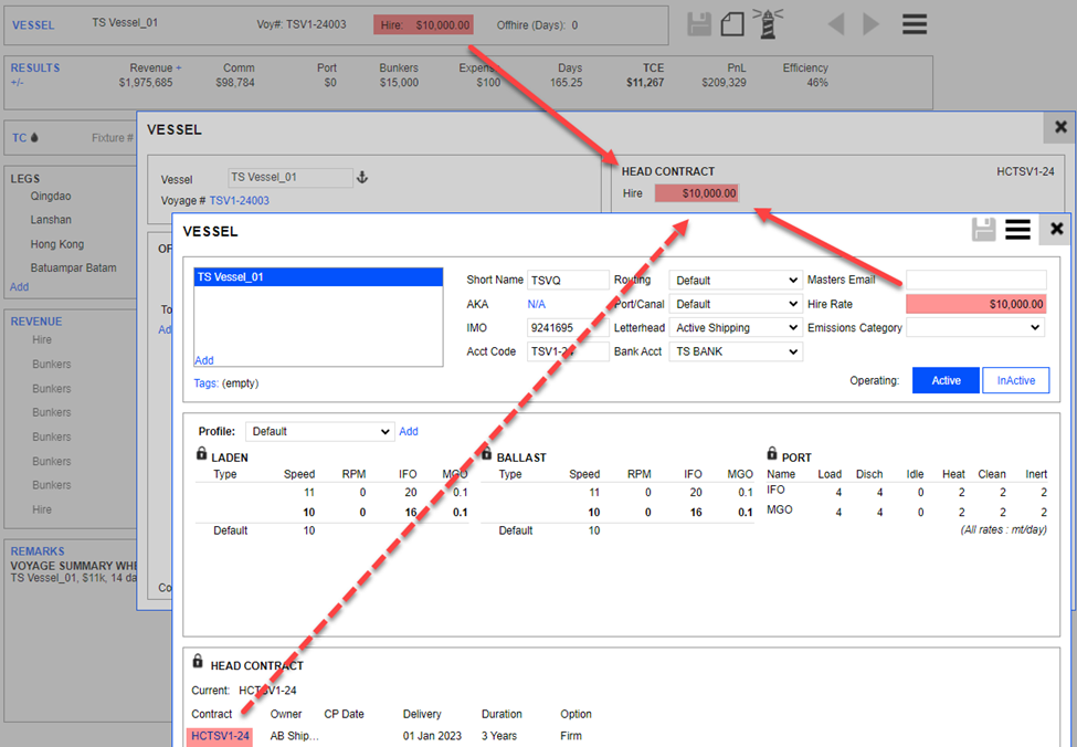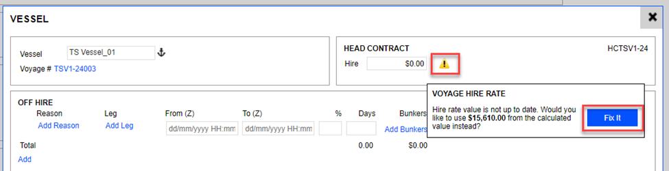 One thing to note is that the ‘Hire’ rate does not automatically show up in the Estimate. Hence, manual input is required at the Estimate level. (Alternatively, the user could set the default Daily Hire Rate in the Vessel Register.) Upon transferring to the voyage, you may see an exclamation icon stating,' Fix it.’ This is the time to obtain rates from the Vessel’s Head Contract.
