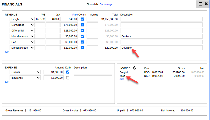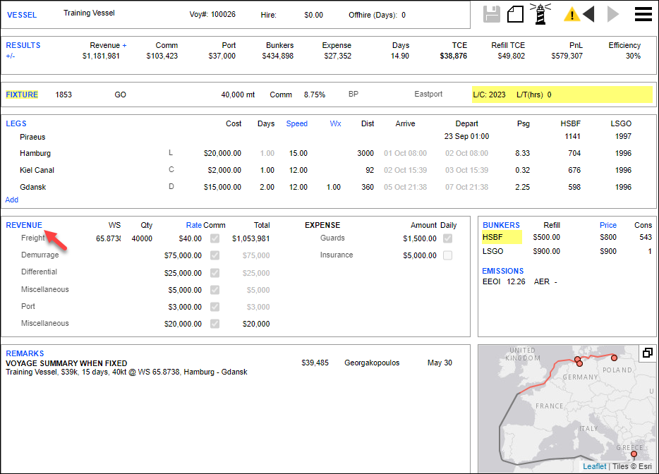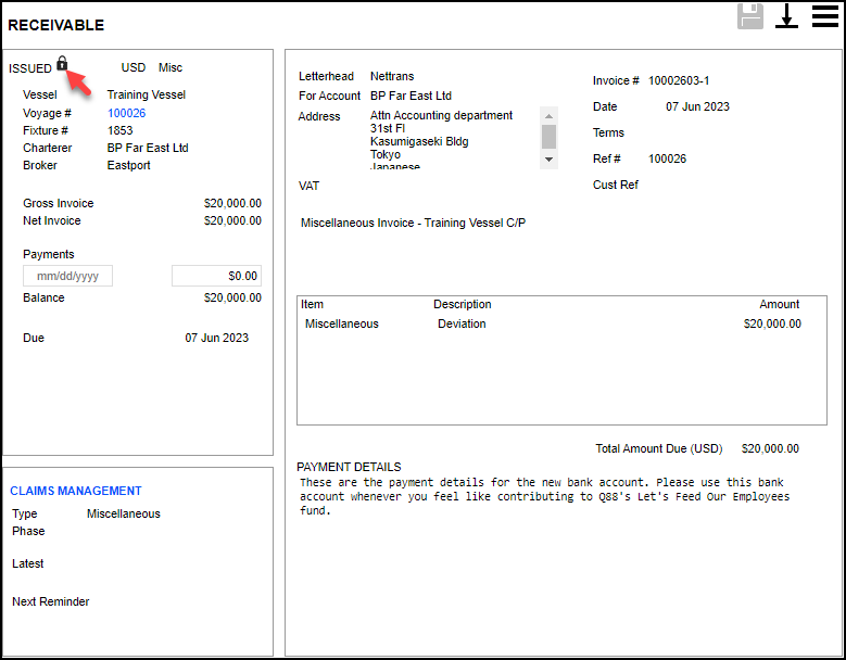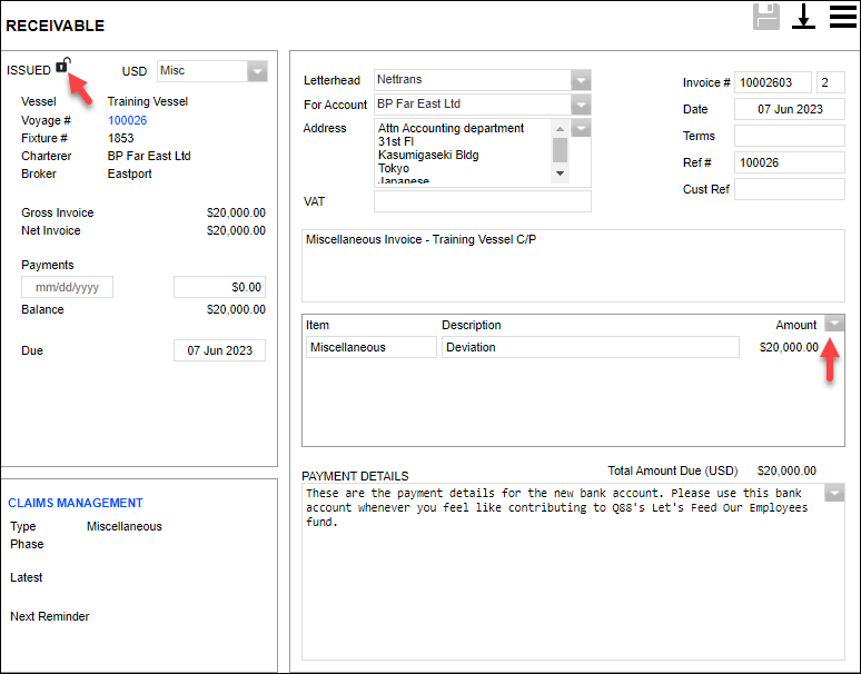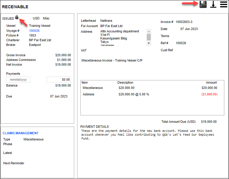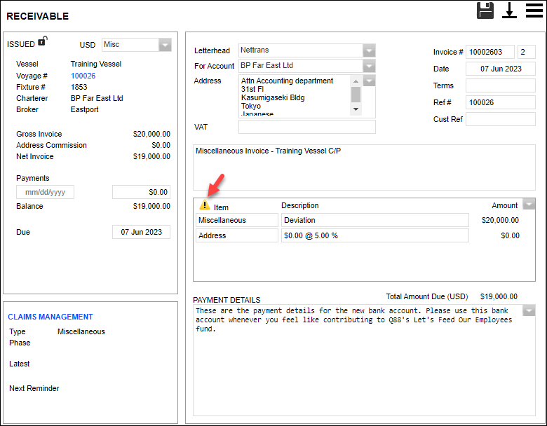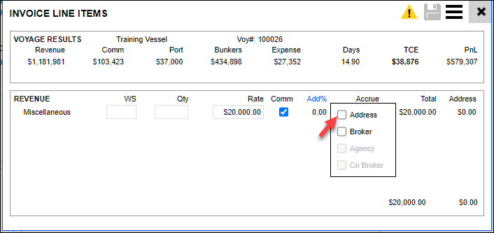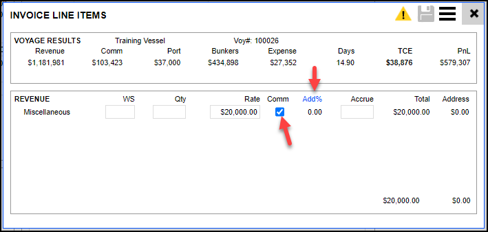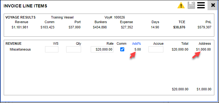 9. Once the voyage and revenue have reconciled, the invoice should appear as above, with the address commission deduction in red.